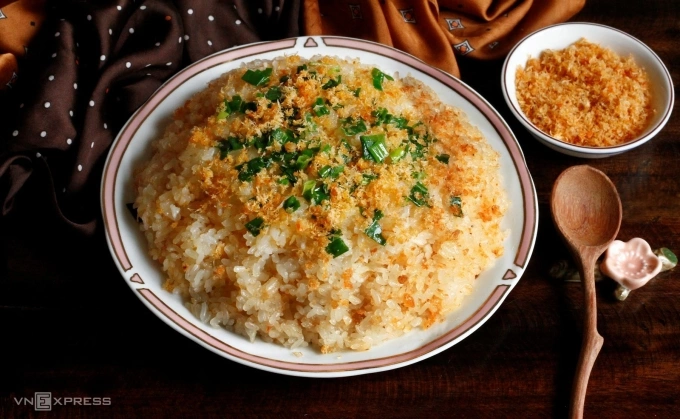 Xôi dẻo mềm quyện vị ngọt thơm tự nhiên từ tôm khô, dậy mùi mỡ hành khá cuốn vị. Món này dùng ăn sáng, dự trữ ngày mưa hay đi xa đều chắc dạ, đủ dưỡng chất.